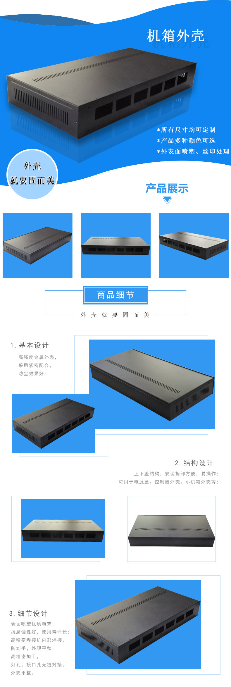 * 此款外殼適用于機(jī)箱外殼,工控服務(wù)機(jī)箱外殼,非標(biāo)金屬機(jī)箱外殼定做,大機(jī)箱外殼來(lái)圖來(lái)樣設(shè)計(jì)。 * 產(chǎn)品材料:鍍鋅板 * 盒體采用開(kāi)孔合理,免工具安裝 * 表面可噴塑,絲印 * 產(chǎn)品顏色和材料批量可訂制 * 所有尺寸均可按要求修改