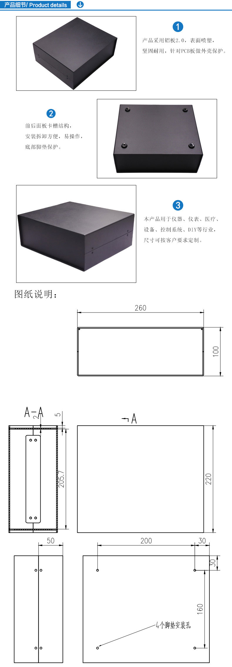 ? ? 1.產(chǎn)品采用鋁板2.0,表面噴塑,堅固耐用,針對PCB板做外殼保護(hù)。