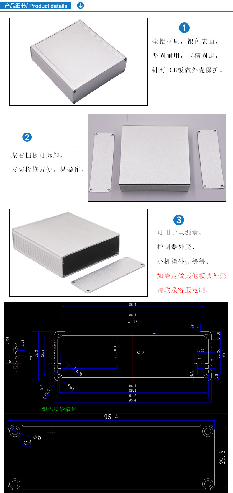 特點(diǎn):1.全鋁材質(zhì),銀色表面,堅(jiān)固耐用,卡槽固定,針對(duì)PCB板做外殼保護(hù)。