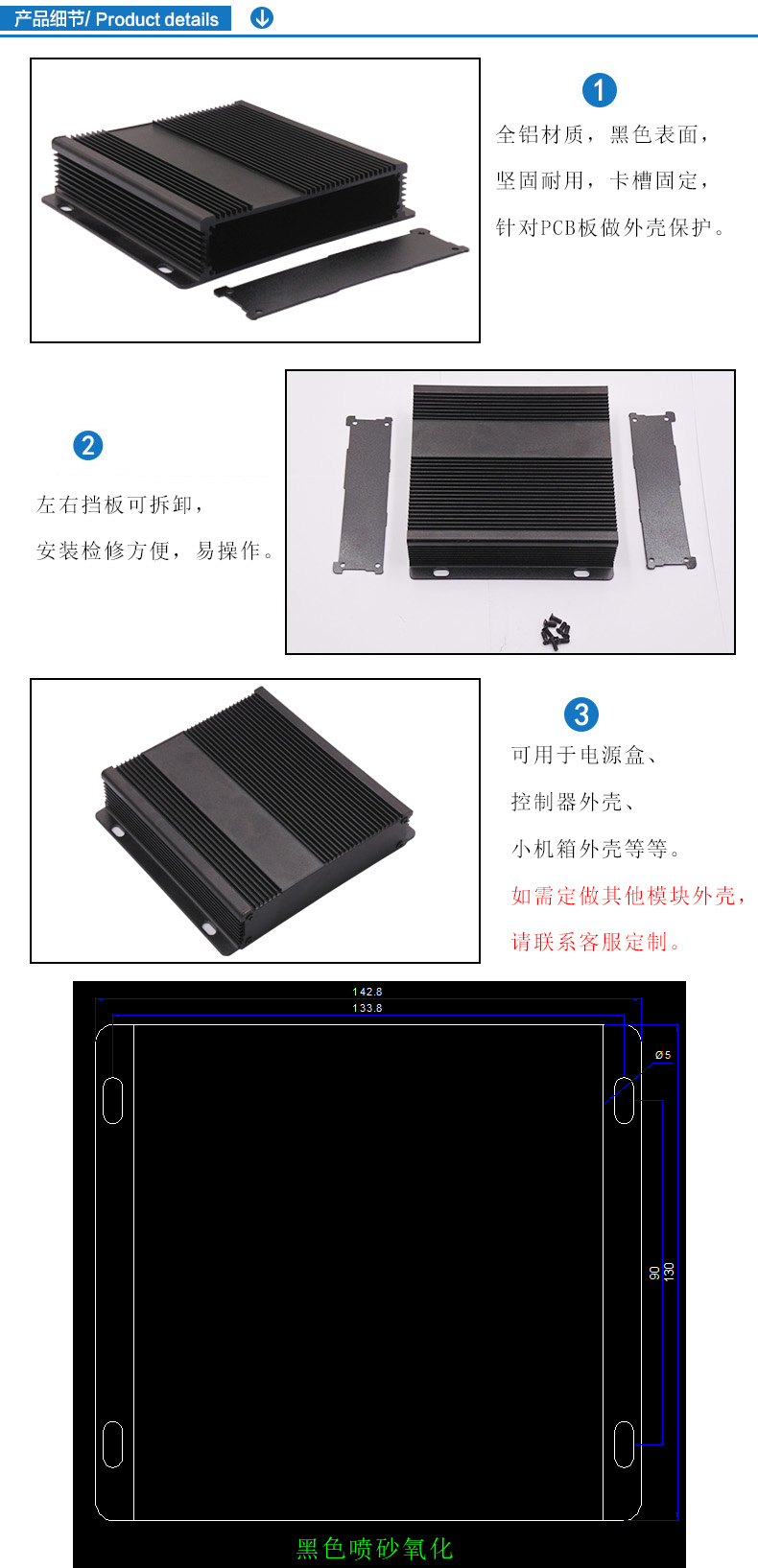 特點(diǎn):1.全鋁材質(zhì),黑色表面,堅(jiān)固耐用,卡槽固定,針對(duì)PCB板做外殼保護(hù)。
