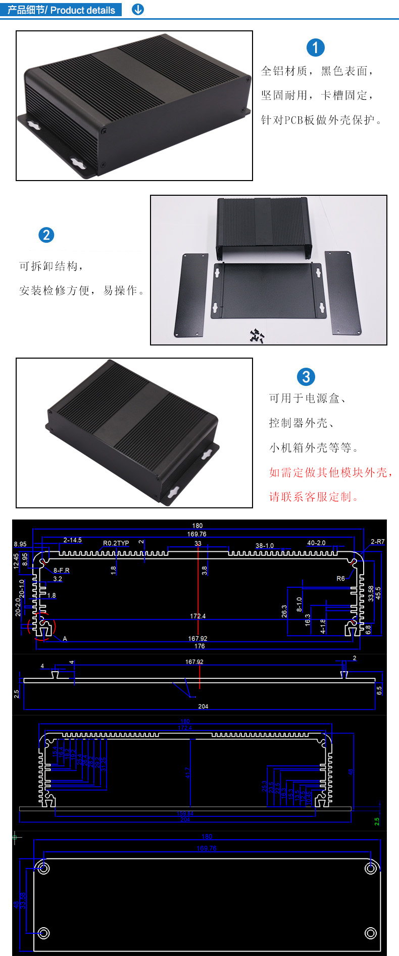 特點(diǎn):1.全鋁材質(zhì),黑色表面,堅固耐用,卡槽固定,針對PCB板做外殼保護(hù)。