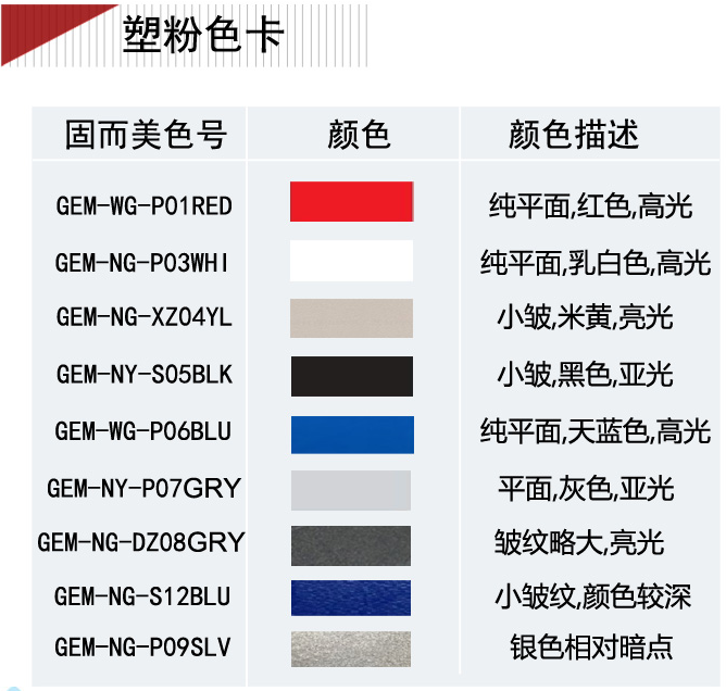 七、外殼表面顏色,以下是我們備有庫(kù)存的噴粉顏色,請(qǐng)選擇【GEM-NY-S05BLK】,如果要其他指定顏色,請(qǐng)注明勞爾色號(hào)或者潘通色號(hào)__________,需要延長(zhǎng)周期和成本。