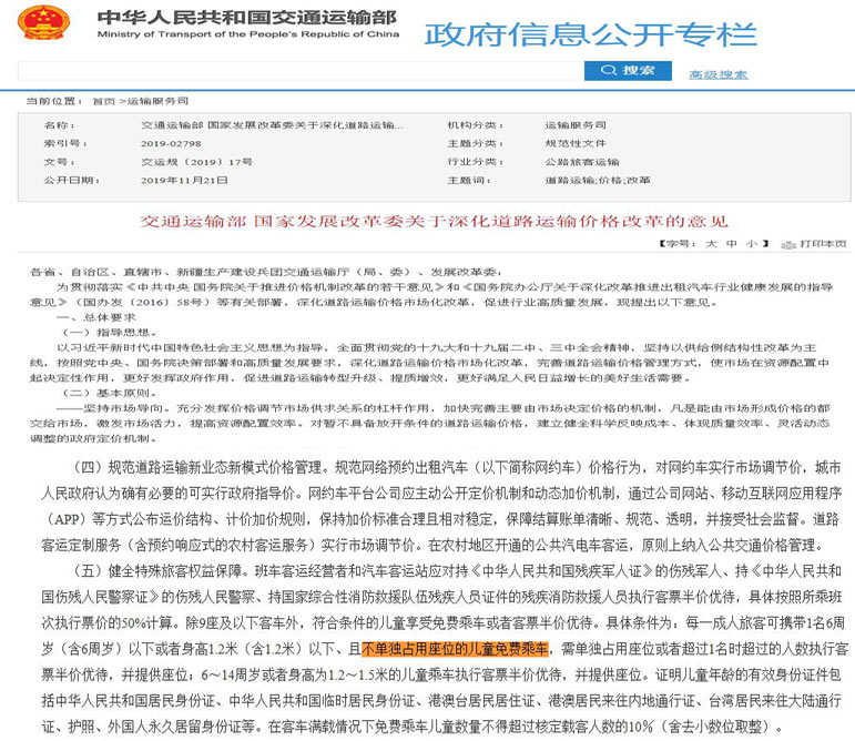 11月21日電(李金磊)交通運輸部會同國家發(fā)改委21日印發(fā)《關(guān)于深化道路運輸價格改革的意見》,明確符合條件的兒童乘坐客運班車享受免費乘車或者客票半價優(yōu)待。在兒童身高標(biāo)準(zhǔn)基礎(chǔ)上,增加以年齡為依據(jù)的兒童票、免票劃分標(biāo)準(zhǔn)。