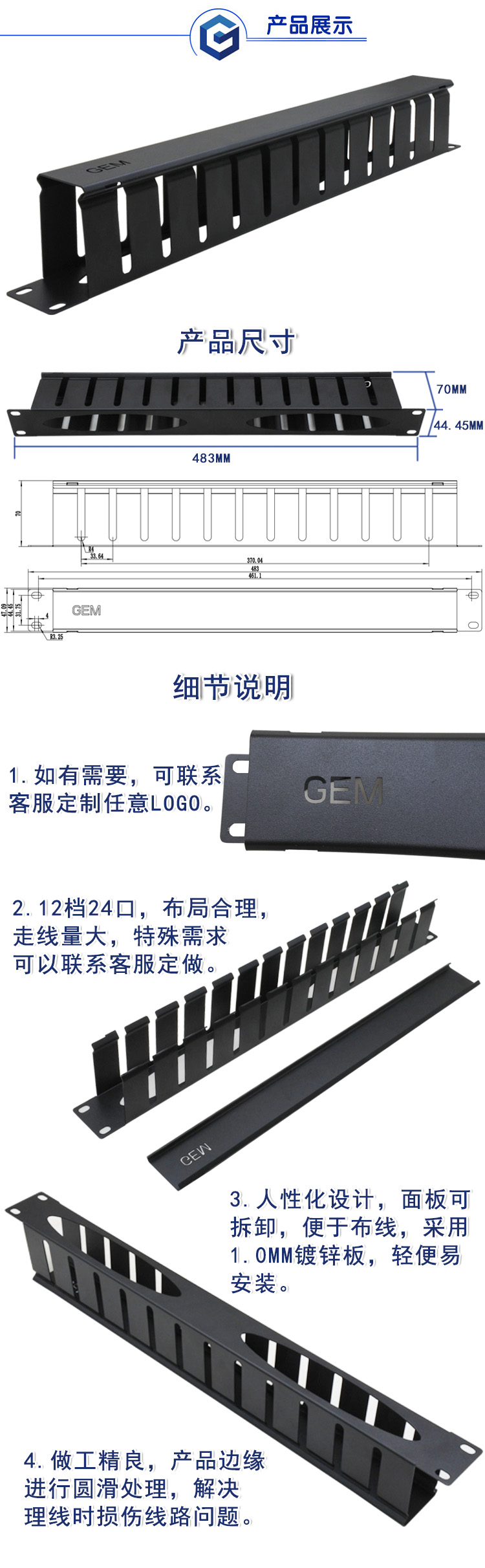 2.人性化設(shè)計(jì),面板可拆卸,便于布線,采用1.0MM鍍鋅板,輕便易安裝。