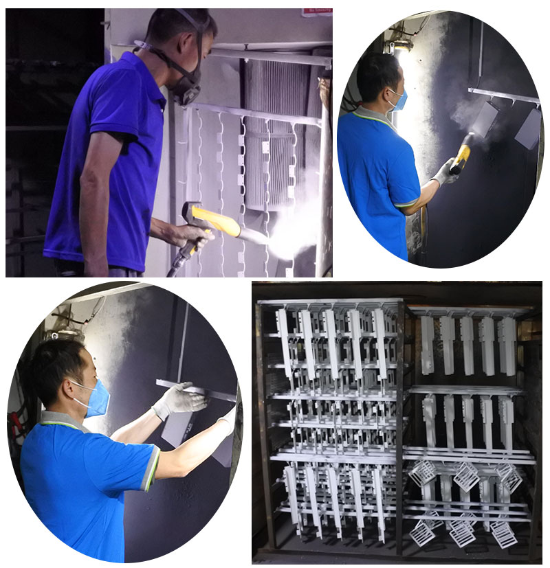 2、用靜電粉末噴涂機(jī)對(duì)產(chǎn)品進(jìn)行粉末噴涂,在高壓靜電環(huán)境下,粉末帶負(fù)極性,粉末通過靜電噴涂槍,形成帶電粒子吸附在產(chǎn)品上。